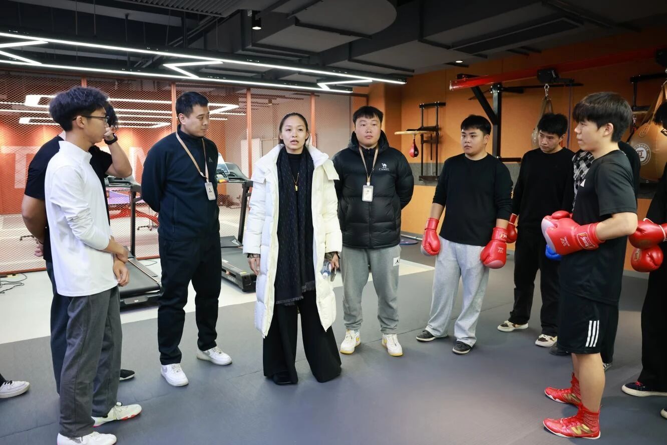 活动中,常园参观了教职工活动中心,并与正在锻炼的师生热情交流,现场气氛热烈。期间,校工会还特别组织了教职工代表参与互动。在看到活动中心设施完善、体育氛围浓厚,尤其是了解到校工会专门为教职工开设了系统化拳击课程后,常园表示高度赞赏,并鼓励教职工积极参与体育锻炼,将拳击运动所激发的活力与斗志融入日常工作与生活。