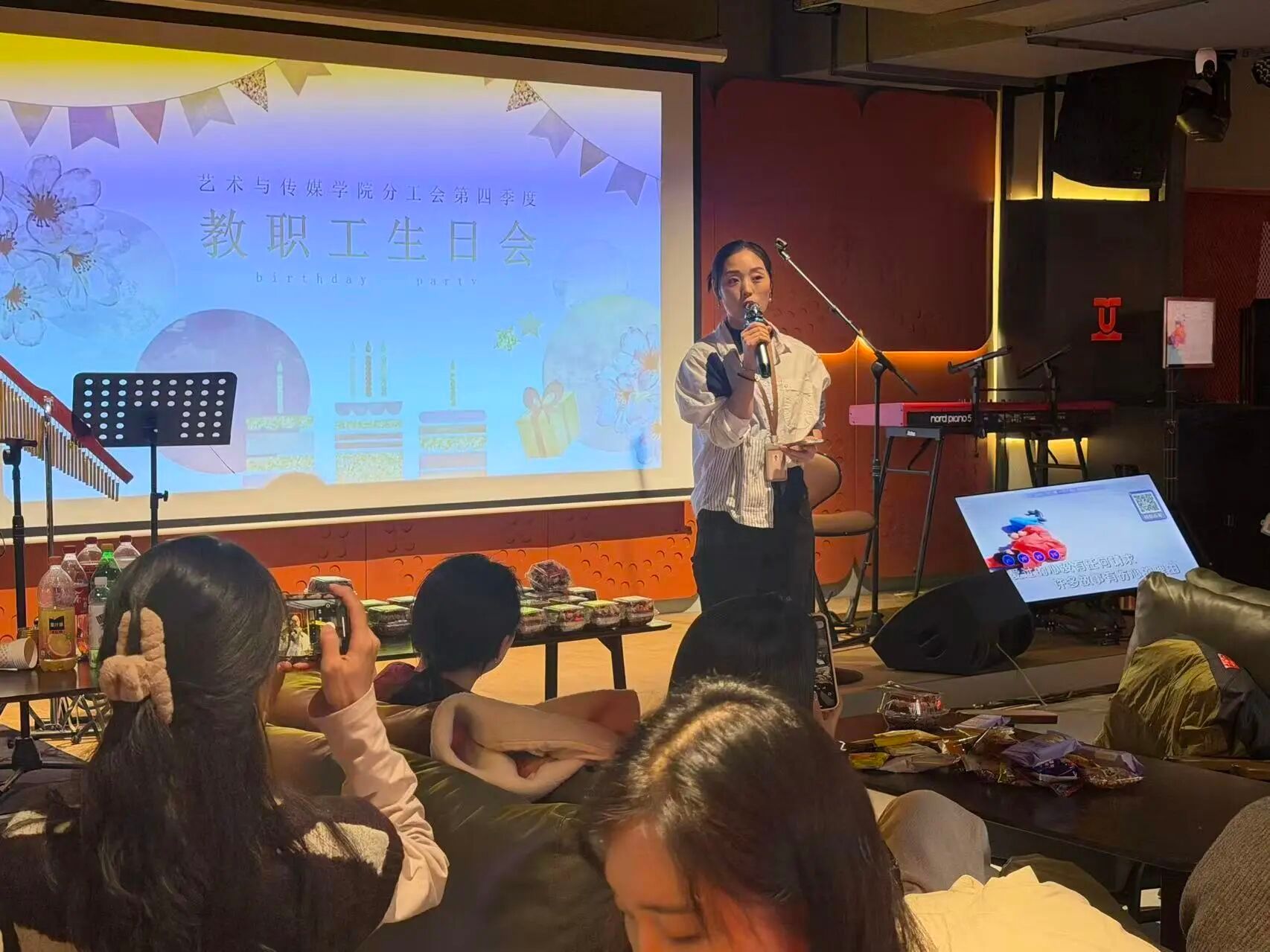 在艺术与传媒学院分工会委员石艺璠主持下,全体在场教师共同唱响生日歌,歌声中饱含同事间的深情厚谊。在温馨的烛光与欢声笑语中,活动进入到“表情包猜成语”“听歌识曲”“你演我猜”等互动游戏环节。老师们踊跃参与,默契配合,现场笑声掌声不断,展现出讲台之外的风采与活力。游戏结束后,封薇老师献唱歌曲,将现场气氛推向高潮。